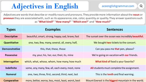 These adjectives are super versatile and can be placed before the noun or after a linking verb. They’re essential for creating vivid imagery and conveying emotions or opinions. When you want to make your readers feel something or see what you’re talking about, descriptive adjectives are your go-to. Imagine describing a sunset: without words like orange , pink , fiery , calm , or breathtaking , the description would be pretty flat. These adjectives are the heart of descriptive writing, allowing you to convey nuances and specific details that make your subject come alive.