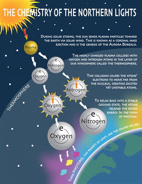 Here’s where the fun begins: when these charged particles from the solar wind collide with atoms and molecules in the Earth’s upper atmosphere (mainly oxygen and nitrogen), they excite these atoms. Think of it like giving them a burst of energy. The excited atoms then release this energy in the form of light. The color of the light depends on the type of gas molecule and the altitude. For example, oxygen produces green and red light, while nitrogen produces blue and violet light. So, the different colors you see in an aurora are a result of these collisions and the different altitudes where they occur. Pretty neat, right? The shape and movement of the aurora are also influenced by the Earth’s magnetic field. The magnetic field lines guide the charged particles, causing the lights to appear in arcs, bands, and curtains.