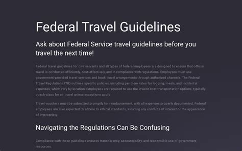 Alright, let’s get into the nitty-gritty of the Federal Travel Regulations . The FTR is the rulebook for government travel, and it’s essential to understand its key components. It outlines the policies and procedures that federal employees and other authorized travelers must follow when traveling on official business. You can find the FTR on the GSA website, which is a great place to start your research. Understanding the FTR is critical for both travelers and those responsible for approving travel.