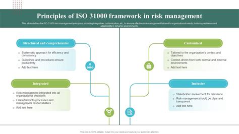 Then there's Customized . This principle is all about recognizing that there's no one-size-fits-all solution when it comes to risk management. What works for a tech startup might be completely different from what works for a large manufacturing plant or a government department. ISO 31000 stresses that your risk management framework, processes, and activities must be tailored to the specific context of your organization. This includes considering your objectives, your internal and external environment, your stakeholders, your culture, and your risk appetite – essentially, what level of risk your organization is willing to accept. You need to customize your approach to ensure it's relevant, proportionate, and effective for *your* unique situation. Trying to force a generic risk management model onto an organization without considering its specific context is like trying to fit a square peg into a round hole – it’s inefficient and unlikely to yield the desired results. Customization ensures that the resources you invest in risk management are focused where they will have the greatest impact and that the strategies you develop are practical and achievable within your organizational constraints. It encourages flexibility and adaptability, allowing the risk management system to evolve alongside the organization. When you customize your approach, you're more likely to gain buy-in from stakeholders because the process will feel relevant to their daily work and the organization's goals. This principle acknowledges the diversity of organizations and the dynamic nature of their environments, promoting a practical and sustainable approach to managing risks. It means really understanding your business, your industry, and the unique challenges and opportunities you face, and then building a risk management system that reflects that deep understanding.