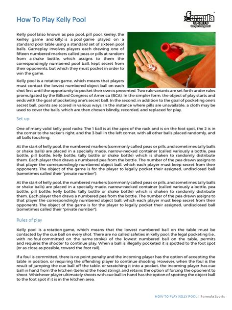 Kelly Pool is a flexible game, and over the years, many variations have popped up to add even more flavor and excitement. One popular variation is called “Rotation Kelly Pool,” which combines elements of both rotation pool and Kelly Pool. In this version, players must still hit the lowest numbered ball first, but they also have the added challenge of figuring out their secret number. This variation can make the game even more strategic, as players have to balance the rotation rules with their secret objectives. Another variation is “Call-Safe Kelly Pool,” where players have the option to call a safety instead of attempting a shot. This can be a useful tactic for defensive play, allowing players to avoid risky shots and maintain control of the table. In some variations, the penalty for pocketing your own ball on an uncalled shot might be different. For example, instead of just spotting the ball, the player might have to reveal their pill and is then out of the game. This adds a higher level of risk to the game. Another fun twist is “Partners Kelly Pool,” where players team up and share a secret number. This can create interesting dynamics and require close communication between partners to strategize effectively. Some players also introduce handicap systems to make the game more fair for players of different skill levels. For instance, a more skilled player might have to reveal their pill earlier in the game, giving their opponents a better chance. These variations can keep the game fresh and exciting, offering new challenges and strategic possibilities. So, feel free to experiment with different rules and find the variations that you and your friends enjoy the most. The key is to have fun and keep the game interesting!