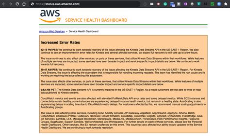 • Check the AWS Service Health Dashboard : The AWS Service Health Dashboard is the first place to check. It provides real-time updates on AWS service health, including Kinesis. It may give you an idea of the scope of the outage, the services affected, and estimated resolution times. AWS will generally post information here during an outage.