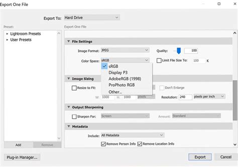 2. Choose Your Destination and File Settings: Before we even get to the color space, make sure your other settings are dialed in. Under the “Export Location” panel, decide where you want to save your files. Under “File Settings” , you’ll choose your Image Format (JPEG, TIFF, etc.) and Quality . For most web use, JPEG at 80-100 quality is perfect. For print, you might opt for TIFF.