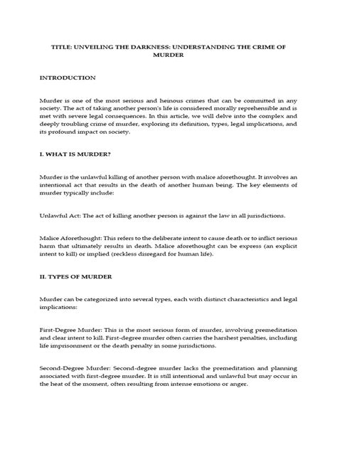 The legal implications and consequences of committing murder are severe and far-reaching, reflecting society’s condemnation of this heinous act. Murder, in its various forms, is considered one of the most serious crimes, and the penalties reflect the gravity of the offense. The legal definitions of murder vary slightly depending on jurisdiction, but generally, murder involves the unlawful killing of another human being with malice aforethought. This means that the killing was intentional, deliberate, and premeditated. However, some jurisdictions also recognize different degrees of murder, such as first-degree murder, second-degree murder, and manslaughter. First-degree murder typically involves premeditation and intent, while second-degree murder may involve intent but not necessarily premeditation. Manslaughter, on the other hand, is typically defined as the unlawful killing of another human being without malice aforethought. This can include voluntary manslaughter, which is committed in the heat of passion, or involuntary manslaughter, which is committed as a result of negligence or recklessness. The penalties for murder vary depending on the degree of the offense and the jurisdiction in which it is committed. In many jurisdictions, first-degree murder is punishable by life imprisonment without the possibility of parole or even the death penalty. Second-degree murder typically carries a sentence of imprisonment for a term of years, while manslaughter may result in a shorter prison sentence or even probation. In addition to imprisonment, individuals convicted of murder may also face other legal consequences, such as the loss of their right to vote, the right to own a firearm, and the right to hold certain types of employment. They may also be required to pay restitution to the victim’s family for their losses. Furthermore, a murder conviction can have devastating consequences for the offender’s personal life. They may lose their relationships with family and friends, and they may face social stigma and discrimination for the rest of their lives. The legal process in a murder case is complex and time-consuming. It typically begins with an investigation by law enforcement, followed by an arrest and arraignment of the suspect. The suspect is then entitled to a trial by jury, where the prosecution must prove their guilt beyond a reasonable doubt. If the suspect is convicted, they have the right to appeal the verdict to a higher court. Guys, the legal implications and consequences of murder are a stark reminder of the value that society places on human life and the importance of holding those who take it accountable for their actions.
