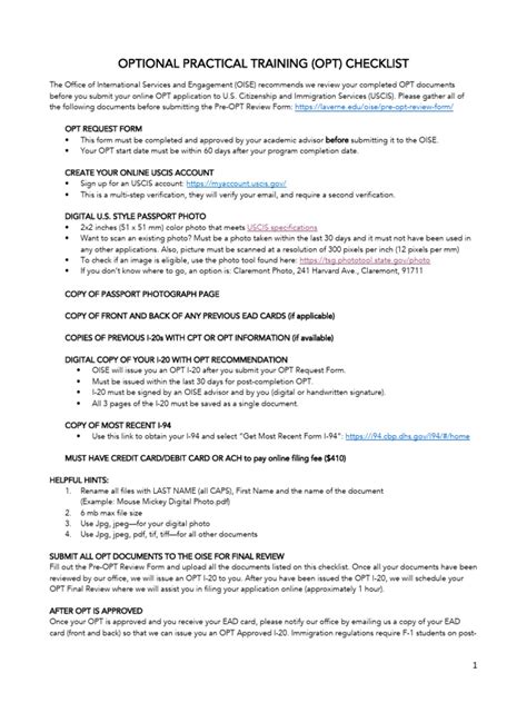 To be eligible for OPT, you must be in valid F-1 status, have been enrolled full-time for at least one academic year, and intend to seek employment directly related to your major field of study. Understanding these requirements is the first step in preparing your OPT application. It’s also important to note the deadlines and processing times, as applying too early or too late can jeopardize your chances. The USCIS (United States Citizenship and Immigration Services) has specific windows for application submission, so mark your calendar!
