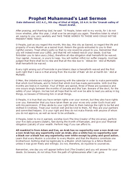 The context is super important, you know? It wasn’t just a random speech given out of the blue. The Prophet was acutely aware of his impending departure from this world. Therefore, the message had to be concise, comprehensive, and memorable, the ultimate guide for his followers to live by after he was gone. He wanted to ensure that the core tenets of Islam were crystal clear and that his community would remain united and righteous. The sermon was a final opportunity to clarify any misunderstandings, reinforce the fundamental principles, and provide a roadmap for the future. It was a moment of immense gravity, a pivotal point in Islamic history. The Prophet’s words were not merely instructions; they were a legacy, a testament to his life’s work, and a profound declaration of faith. He wanted to make sure everyone was on the same page, understanding the faith and living by it. This was his last chance to ensure the longevity and purity of the message he had brought to the world. It was a moment of farewell, a moment of guidance, and a moment of profound importance for the Muslim community and for humanity at large.