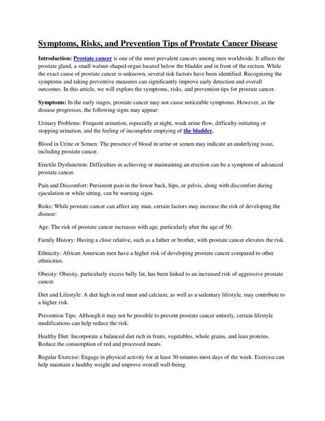 So, we’ve talked about the causes and risk factors, but how do we translate that into concrete prevention strategies for prostate cancer ? It’s all about being proactive and smart. The first and arguably most critical strategy is regular screening . Talk to your doctor about when you should start getting screened and how often. For most men, this typically involves a digital rectal exam (DRE) and a prostate-specific antigen (PSA) blood test. These screenings are designed to detect the cancer early, when it’s most treatable. Don’t wait for symptoms to appear; catching it early is key. Know your family history – we can’t stress this enough. If you have a strong family history of prostate cancer, inform your doctor immediately. This might mean starting screenings earlier or having them more frequently. Consider genetic testing if it seems appropriate based on your family history and doctor’s recommendation. Adopt a prostate-friendly diet , as we discussed. Load up on those colorful fruits and vegetables, lean proteins, and healthy fats. Minimize processed foods, red meat, and excessive dairy. Think of your diet as fuel for a healthy body that fights off disease. Maintain a healthy weight through a combination of diet and exercise. Shedding those extra pounds can significantly lower your risk. Get moving! Regular physical activity is a powerful tool. Find activities you enjoy and make them a consistent part of your routine. Quit smoking . If you smoke, this is a major step towards reducing your risk of not only prostate cancer but many other serious diseases. Seek support if you need it; there are many resources available to help you quit. Limit alcohol intake . If you drink, do so in moderation. Excessive alcohol consumption can negatively impact your overall health. Manage stress . While not directly linked as a cause, chronic stress can weaken your immune system. Find healthy ways to manage stress, like meditation, yoga, or spending time in nature. Stay informed . Keep up-to-date with the latest research and recommendations regarding prostate cancer. Health information evolves, so it’s good to stay current. Empower yourself . Ultimately, prevention is about taking an active role in your own health. It’s about making informed choices and working in partnership with your healthcare provider. Don’t be afraid to ask questions and advocate for yourself. These strategies, when combined, create a robust defense against prostate cancer. It’s about building a healthier lifestyle that benefits your entire body, not just your prostate. Remember, guys, taking these steps today is an investment in your future health and well-being. It’s about living a longer, healthier, and more fulfilling life.