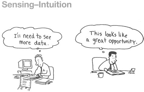 Alright, let’s explore the world of Intuition ! Intuitive types are all about possibilities, imagination, and innovation. They’re the ones who are always brainstorming new ideas, exploring different perspectives, and connecting the dots in unexpected ways. Think of a writer, an artist, or a scientist – these are often roles that N types would be drawn to because they require creativity, abstract thinking, and a willingness to explore the unknown. The strengths of Intuitive types lie in their ability to see patterns, generate ideas, and think outside the box. They’re excellent at spotting opportunities, anticipating future trends, and inspiring others with their vision. They are usually the big-picture thinkers who can see the forest for the trees. They bring a creative spark to the table.