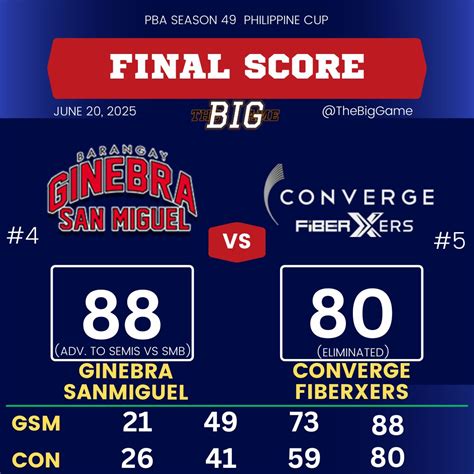 Stay tuned for live updates and real-time highlights as the game unfolds! We’ll be providing minute-by-minute coverage of all the action, including scoring plays, key defensive stops, and momentum-shifting moments. Be sure to refresh this page frequently to stay up-to-date on the latest developments. First Quarter: The game starts with both teams trading baskets, setting an up-tempo pace. San Miguel relies on June Mar Fajardo’s inside presence, while Converge counters with Jeron Teng’s slashing drives. The quarter ends with a close score, setting the stage for a competitive battle. Second Quarter: Converge starts to heat up from beyond the arc, with Maverick Ahanmisi knocking down multiple three-pointers. San Miguel struggles to contain Converge’s outside shooting, allowing the FiberXers to build a lead. Chris Ross steps up for the Beermen, orchestrating the offense and making key defensive plays to keep them within striking distance. Third Quarter: San Miguel comes out strong in the third quarter, tightening up their defense and attacking the basket with authority. June Mar Fajardo dominates the paint, scoring at will and grabbing crucial rebounds. Terrence Romeo catches fire, hitting contested jumpers and igniting the Beermen’s offense. The quarter ends with San Miguel regaining the lead. Fourth Quarter: The fourth quarter is a back-and-forth affair, with both teams exchanging blows. Converge refuses to go down without a fight, with Jeron Teng leading the charge. San Miguel relies on their veteran experience to maintain their composure and execute down the stretch. The final minutes are filled with drama, as both teams make clutch shots and fight for every possession. In the end, San Miguel emerges victorious, securing a hard-fought win against a resilient Converge team. The game was a thrilling display of basketball, showcasing the talent and competitiveness of both teams!