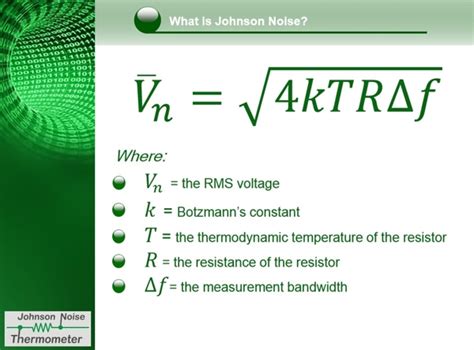 For those of you who are into the math behind it, the root mean square (RMS) value of the Johnson noise voltage (Vn) in a resistor is given by the formula: