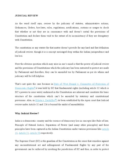 Alright guys, let’s talk about the core principles that guide judicial review . These aren’t just random ideas; they are the bedrock upon which fair and effective judicial review is built. One of the most fundamental principles is the presumption of constitutionality . This means that when a court reviews a law or government action, it starts with the assumption that it is constitutional. The burden of proof is on the person challenging the law to show why it violates the constitution. This principle reflects a respect for the legislative process and prevents courts from overturning laws too easily. It ensures that courts act as a check, not as a super-legislature. Another crucial principle is judicial restraint . This means that courts should exercise their power of judicial review cautiously and defer to the judgment of the elected branches whenever possible. Judges are not supposed to substitute their own policy preferences for those of the legislature. They are meant to interpret the law, not make it. Think of it as a guideline for judges to be humble and aware of their role within the broader governmental structure. The principle of separation of powers is also inextricably linked to judicial review. The very existence of judicial review is a manifestation of this principle, ensuring that the judiciary can act as a check on the other branches. However, it also means that the judiciary must respect the distinct roles of the legislative and executive branches. The principle of due process is paramount. This ensures that any legal proceeding, including judicial review, must be fair and provide all parties with proper notice and an opportunity to be heard. It’s about ensuring procedural fairness throughout the entire process. Finally, the principle of proportionality often comes into play, especially when fundamental rights are involved. It requires that any government action that interferes with a fundamental right must be necessary and go no further than required to achieve a legitimate government objective. This prevents overly broad or disproportionate restrictions on rights. These principles work together to ensure that judicial review is a robust but also a carefully managed power. They help maintain the balance of power, protect individual liberties, and uphold the integrity of the legal system. It’s all about ensuring that this vital function is performed responsibly and with due respect for the democratic process. These guiding lights make sure the whole system doesn’t go off the rails, guys.
